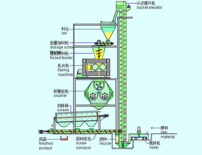 各種干粉物料從設備頂部加入,經(jīng)脫氣、螺旋預壓進入兩個平等軋輥,軋輥相對旋轉,物料被強制送入兩輥之間,軋輥將物料咬入輥隙進行強制壓縮,物料通過壓縮區(qū)后,物料的表面張力和重力使之自然脫出。脫出后的指條狀團塊進入碎粒機由旋轉刀排破碎,被破碎的物料進入整粒機通過滾動刀排使顆粒和部分粉狀物料進入旋振篩進行篩分。合格品通過輸送機被送入成品倉。粉狀篩下物料通過輸送機再次被送回原料倉進行二次輥壓,擠壓力的大小可根據(jù)造粒操作的需要由液壓系統(tǒng)進行調(diào)節(jié)。 通過改變輥面開槽形式,可得到片狀、條狀、扁球狀等物料。